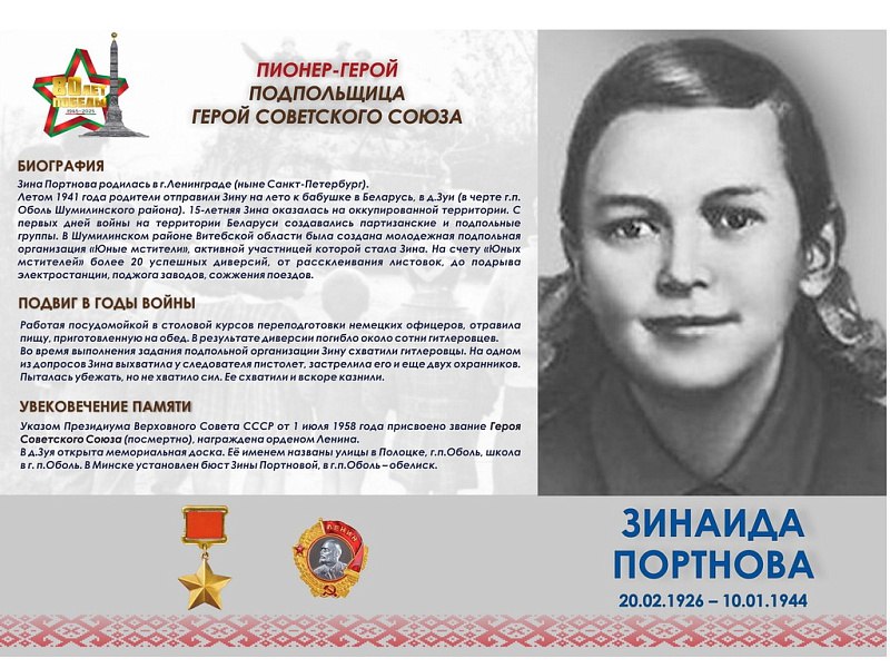 Их имена навсегда вписаны в историю Победы: Марат Казей, Зина Портнова, Тихон Баран, Борис Цариков, Владимир Щербацевич — пионеры-герои, удостоенные звания Героя Советского Союза. Их подвиг бессмертен: именами юных героев названы улицы и школы, их память увековечена в памятниках и мемориалах по всей Беларуси.