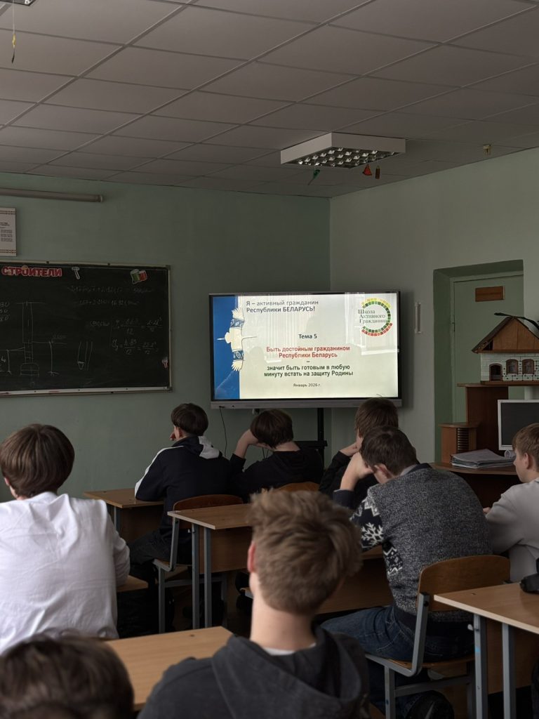 05.02.2026 состоялось очередное мероприятие ШАГа «Школа Активного Гражданина» по теме: «Быть достойным гражданином Республики Беларусь – значит быть готовым в любую минуту встать на защиту Родины». В целях визуализации обсуждаемой информации использовалась мультимедийная презентация, подготовленная Национальным институтом образования. В фокусе обсуждения участников информационно-образовательного проекта были вопросы мира как безусловной ценности и необходимого условия жизни, благополучия и развития; Вооруженные Силы Республики Беларусь; система военного образования в Республике Беларусь; военно-патриотические клубы учащихся.
